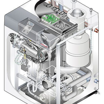 Kedlen kører meget støjsvagt pga. den integrerede lyddæmper for røggas og indsugningsluft. Bag kedlens låge findes i øvrigt en oliefilteraflufter, som er nem at vedligeholde.