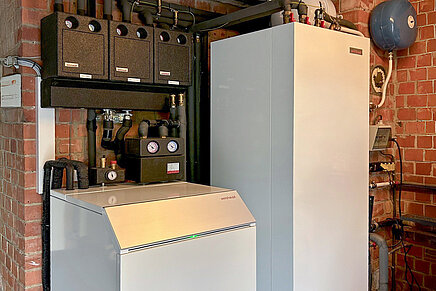 Valget faldt på den modulerende luft/vand-varmepumpe Biblock® WBB 12 og en WKS kombibeholder, som består af en 300-liters Varmtvandsbeholder , en bufferbeholder og alle nødvendige komponenter. Dette anlæg krævede ikke mere plads end det tidligere anlæg.